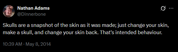 Player heads now update to match the current skin of the player they belong to whereas in previous updates they would remember the texture of when they were created. This may be an intended feature, but I feel it is a negative change from its previous behavior. I often use player heads as custom details in both survival and creative builds, but this requires that they keep the textures that I make for them.