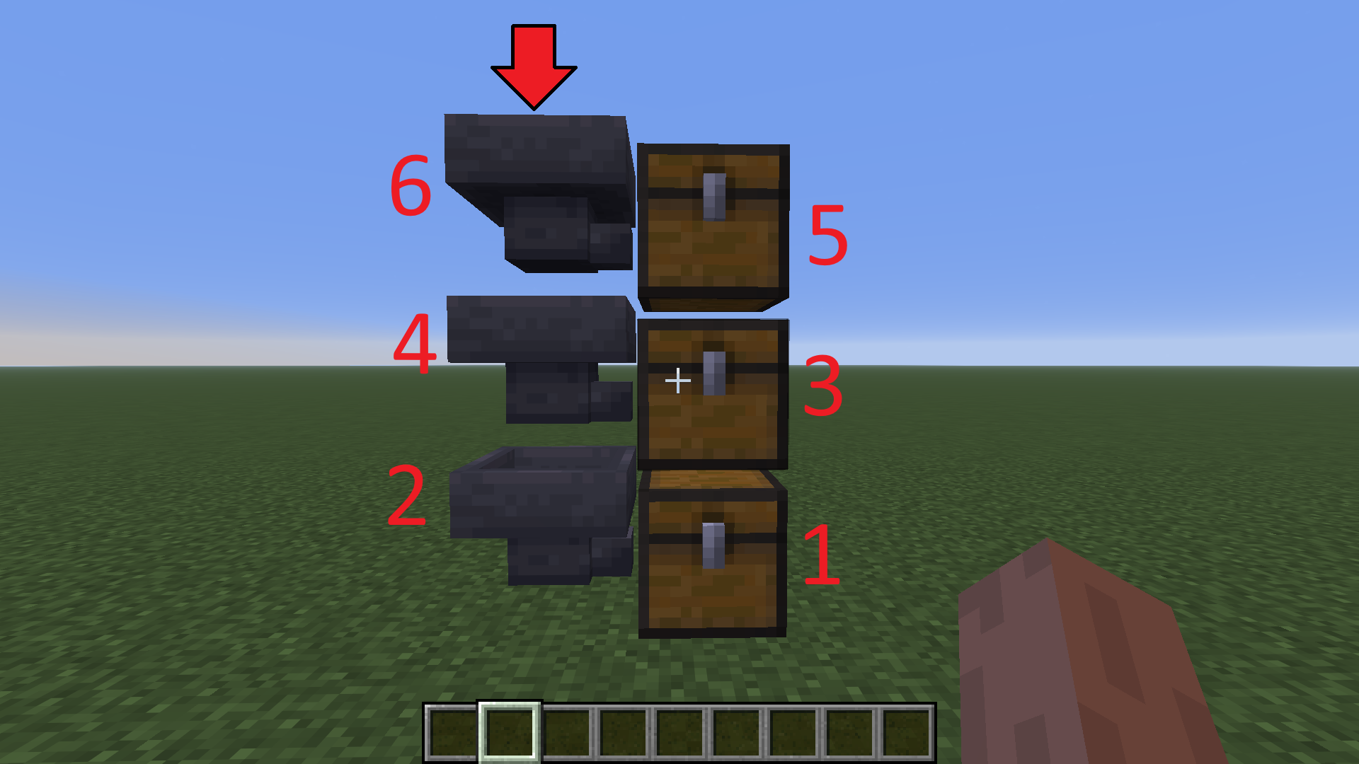 Fill the top hopper again and again, until all the containers (chests and hoppers) are filled. In the meantime, observe the order in which the containers fill up.