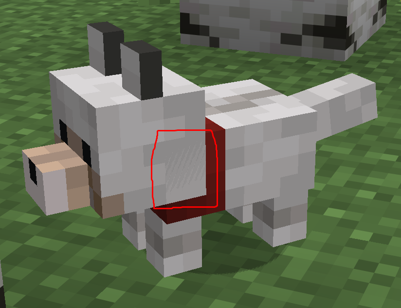 The body of the baby wolf z-fights with its other limbs, and when sitting down, the body’s uv map completely messes up, causing the collar to not be oriented correctly.
