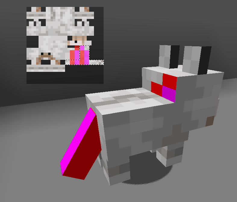 The UV map for the baby wolf’s tail uses the incorrect dimensions (2x6x2 pixels instead of the expected 2x2x6), causing texture issues such as part of the head texture appearing on the tail.