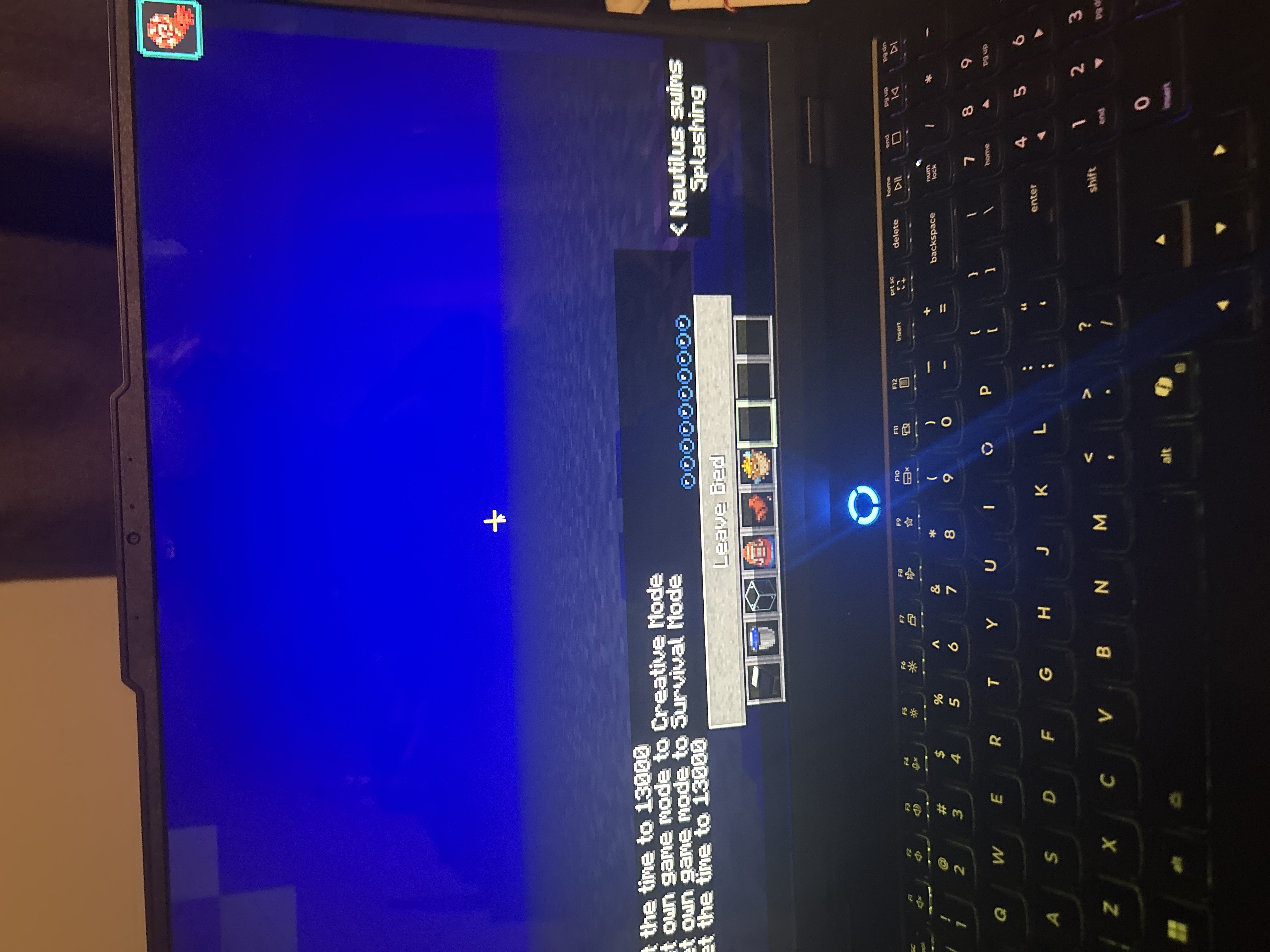 When a player is riding a nautilus, is submerged in water, and right clicks to sleep on a bed, the player will be able to sleep but will not be teleported onto the bed as normal and instead lie down where they were on the nautilus and dismount it. As shown in the screenshot, this allows a player to sleep while underwater.