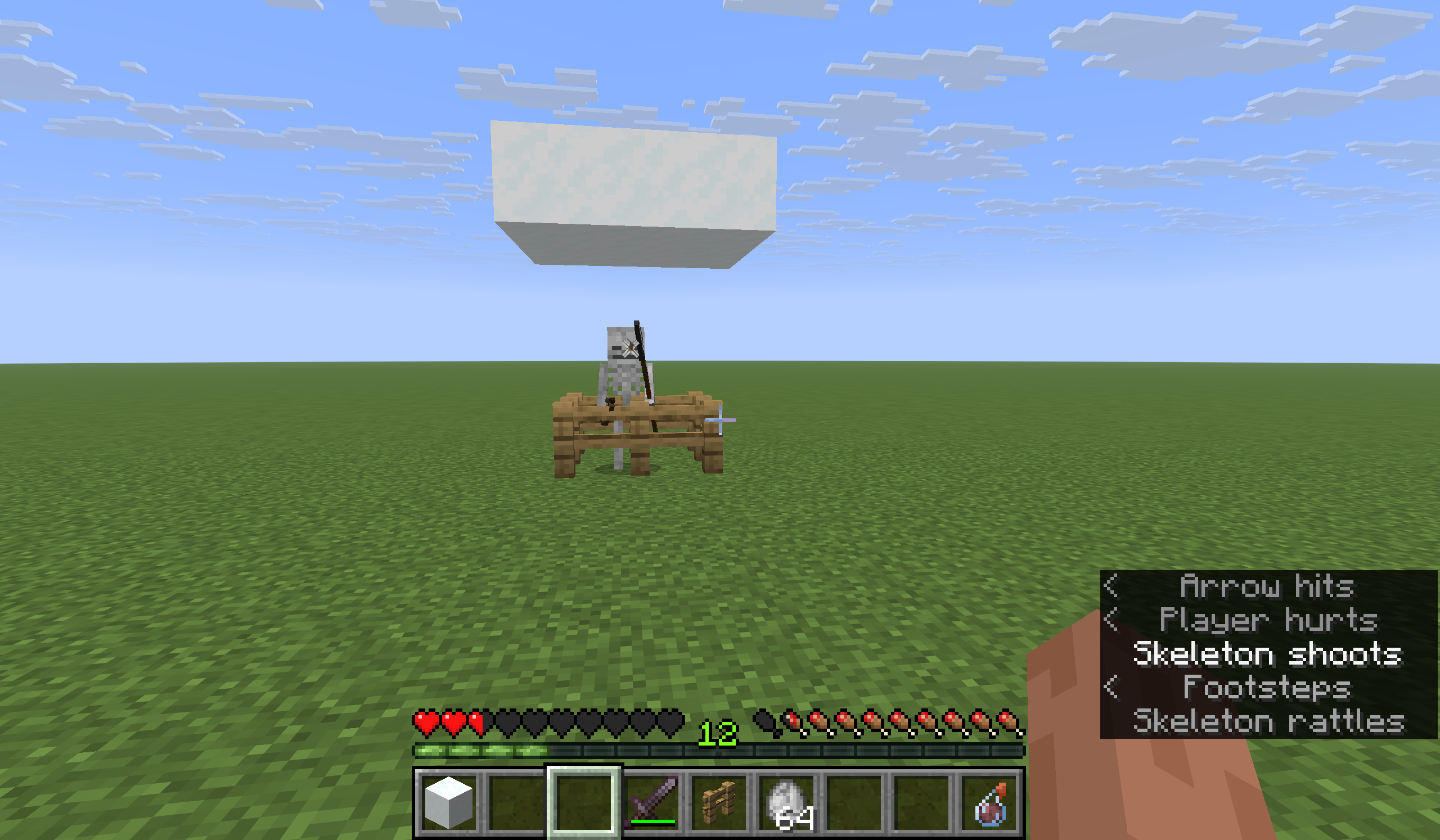 /summon minecraft:skeleton ~ ~ ~ {equipment:{mainhand:{id:"bow",count:1},offhand:{id:"diamond_spear",count:1}}}Aggro the skeleton and observe its arm animation immediately after it fires an arrow.