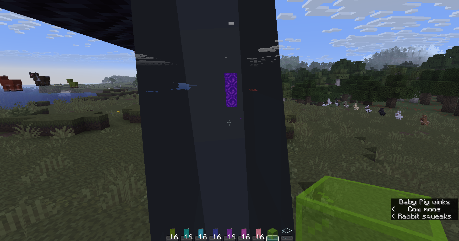Screenshot including nether portal, water, drip particle, and mooshroom mushrooms.