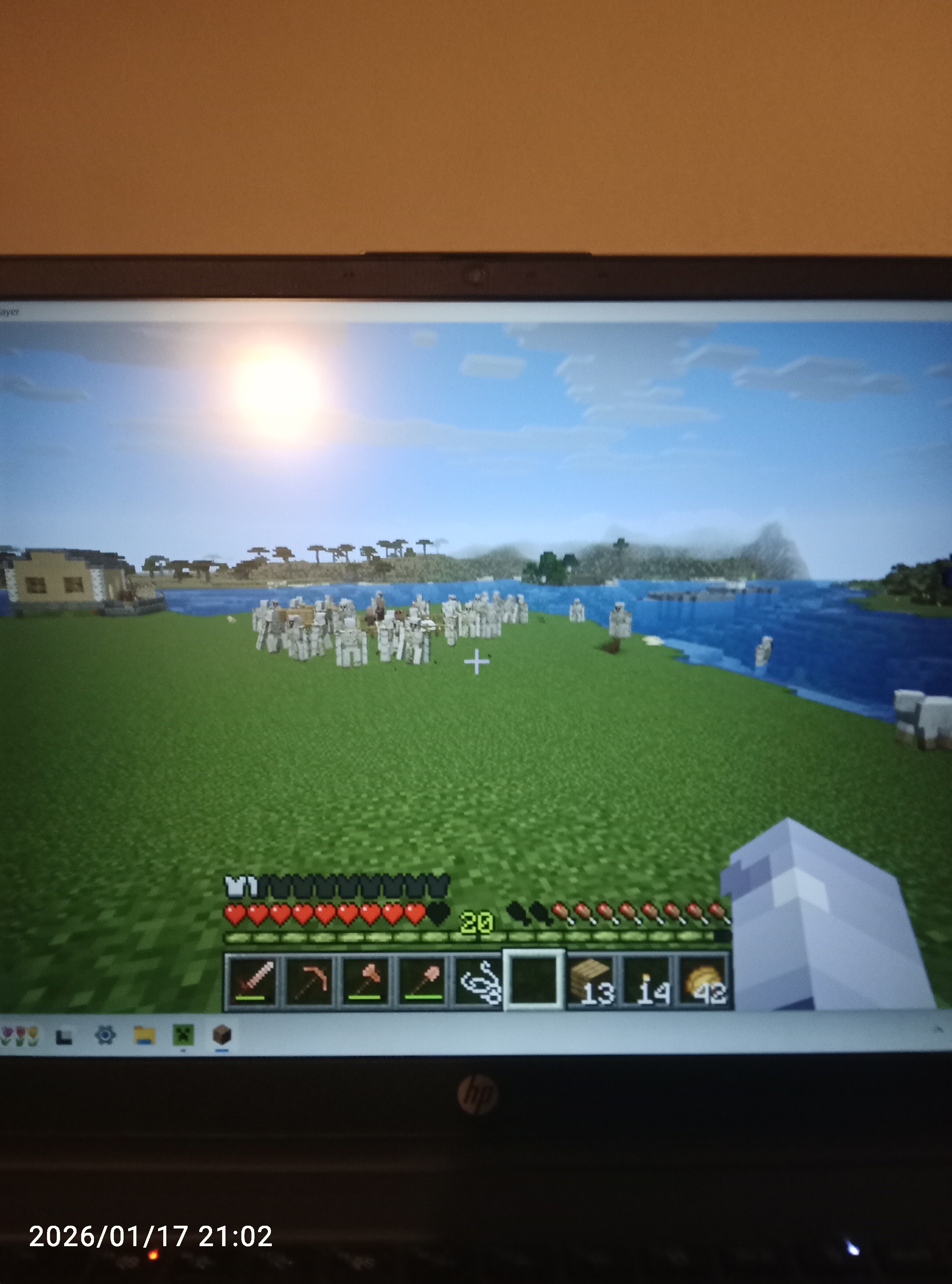 A 7 by 7 fenced-in area with ten beds and seven villagers, surrounded by iron golems, in a forest biome that has been cleared out.