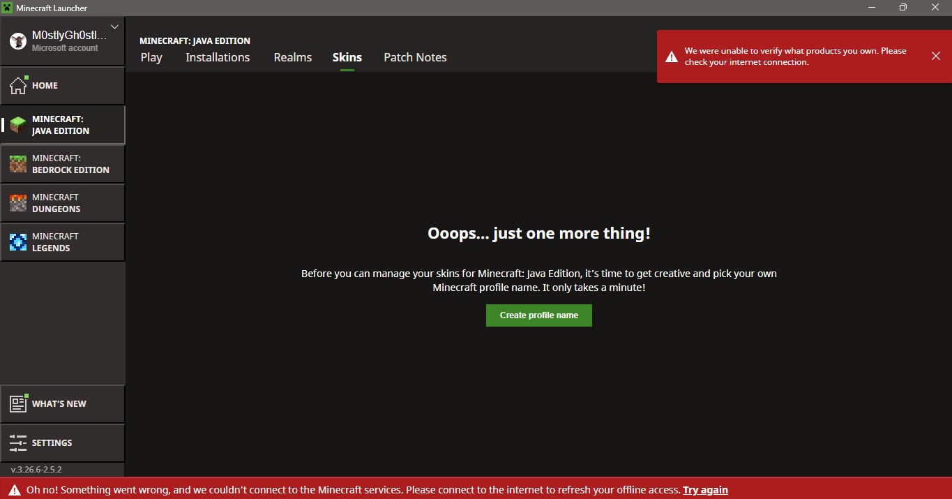 and i haven't had any issues with it since then until now. I tried logging into my Java account via the launcher and it couldn't connect to the verification servers. So i tried logging out and logging back in to find out that my bedrock account works, but not my java account. I do not have access to it anymore and it thinks i dont even have a java account. Help!