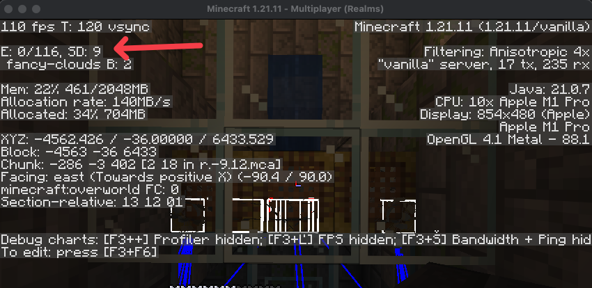 Enabling the debug option entity_render_stats through F3+F6 adds this information, but the the number of entities in the player’s FOV (first number) is always 0.