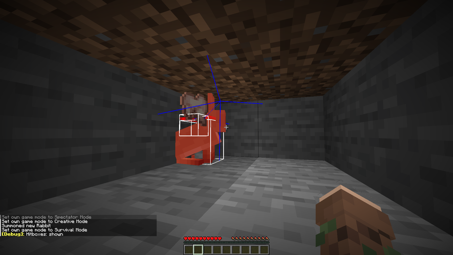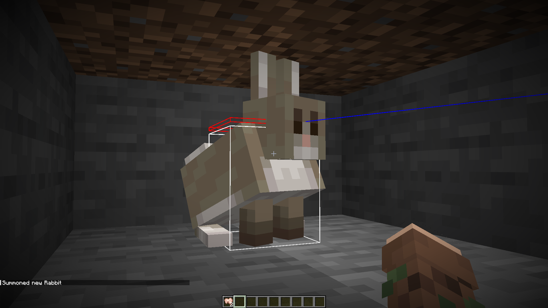 Following the recent rabbit model and animation overhaul, the rabbit's red hurtbox is now misaligned. It is positioned higher than the physical white hitbox, causing rabbits to take suffocation damage when jumping in 1-block high spaces.