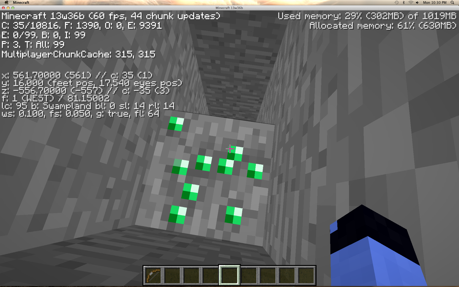 As you see in the picture below I am pressing the f3 button and is shown that I am on Swampland biome. Emeralds can only spawn on Extreme Hills biome.