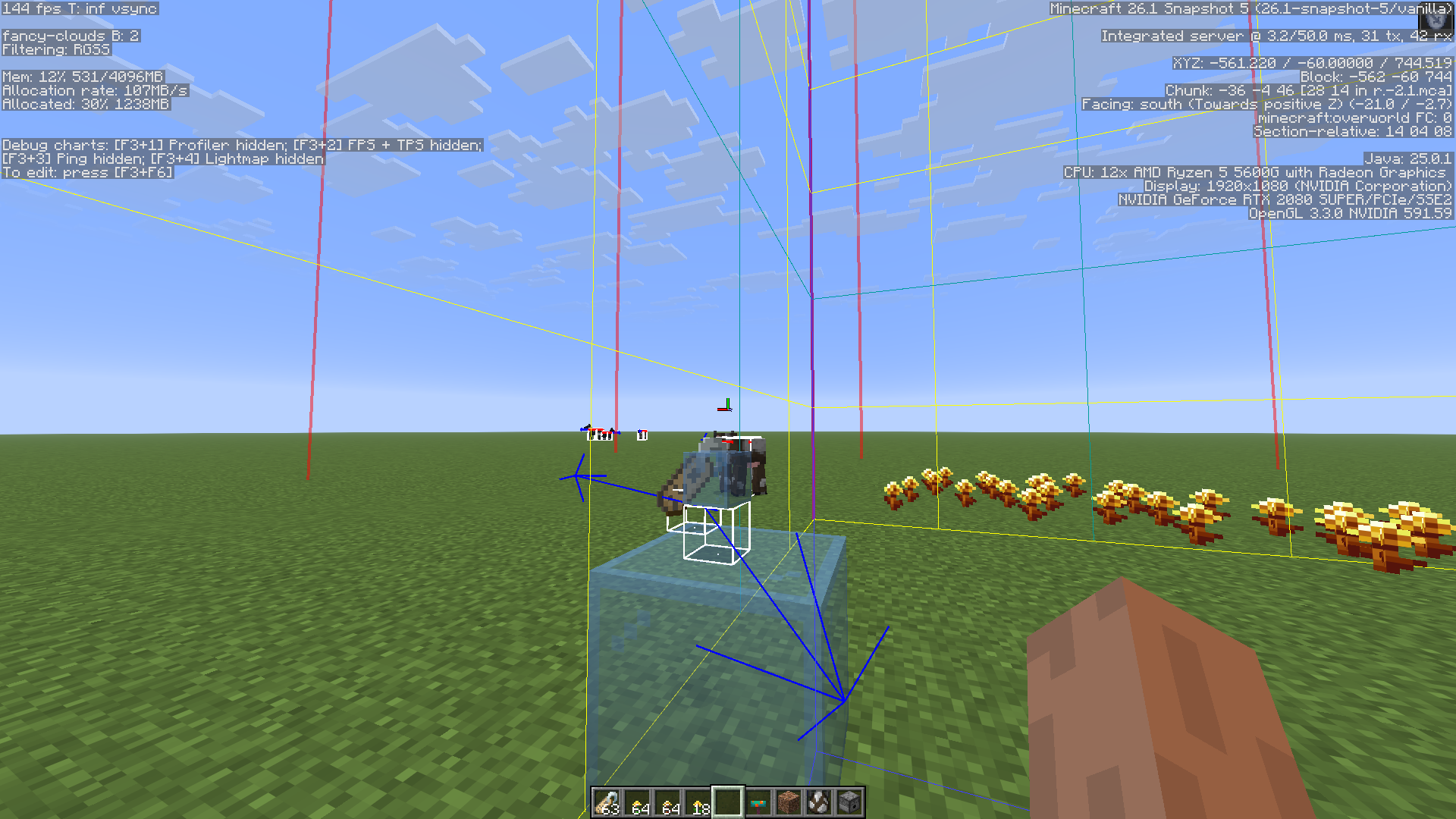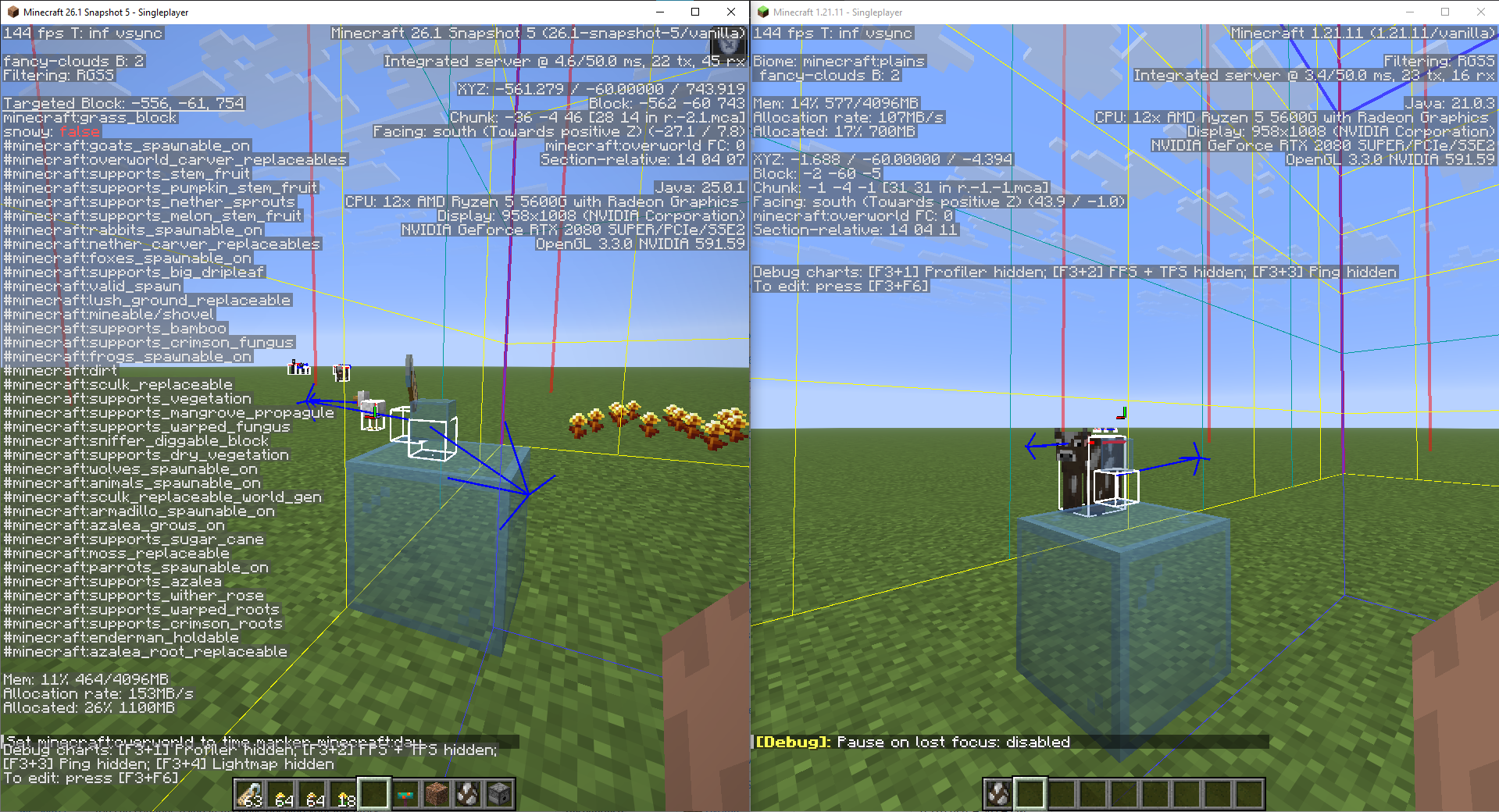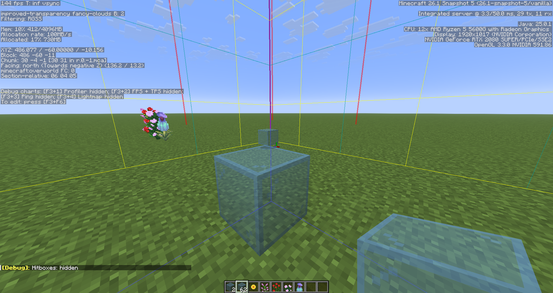Debug gizmos like hitboxes and chunk borders do not render behind translucent items. This has been occurring since 26.1 Snapshot 4.