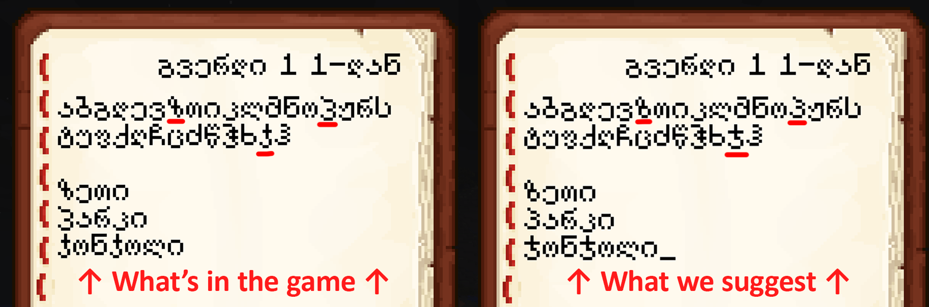 (Letter "ჯ" has two ways of writing, but nowadays we use the one presented in picture) Even though some may think those are some minor requests, this kind of change is necessary for better experience from the game. It's harder to read when letters don't look like themselves, or overall style is violated, it's equivalent of some letters from other writing systems to be upper or lower by 1 pixel, or bigger or smaller.