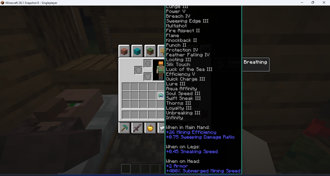 在1.26.1的第六个快照,我们可以给任何武器装备附魔他不应该有的属性