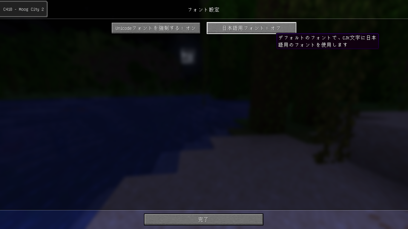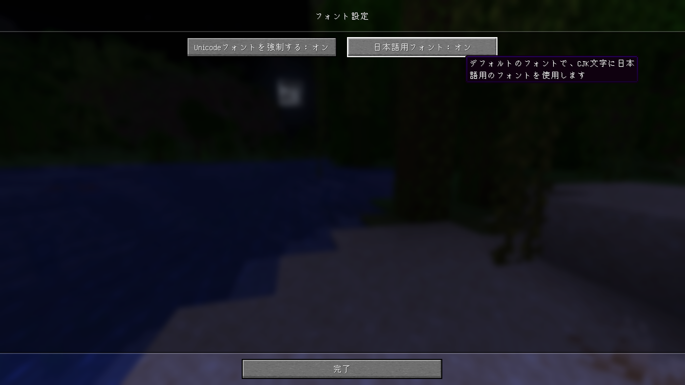 When the "Japanese Glyph Variant" option is enabled, Minecraft uses the Unifont JP font for Japanese-standard Kanji glyphs, while the regular Unifont is used for simplified Chinese-standard glyphs.
