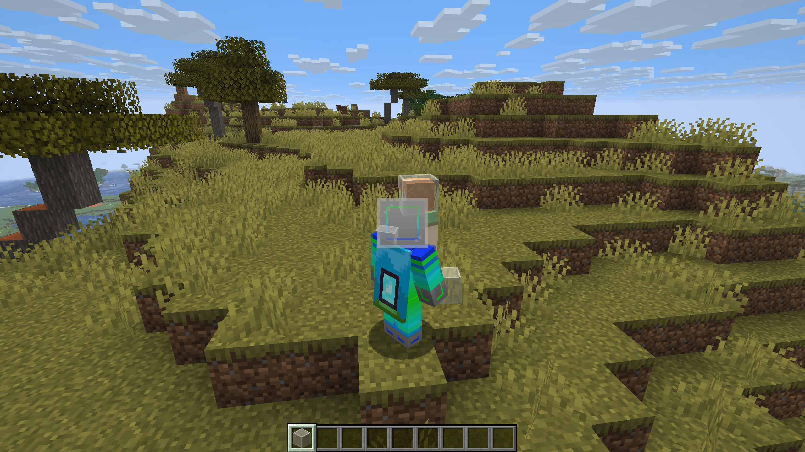 /give @s minecraft:white_stained_glass[minecraft:equippable={slot:head}]and equip it. Next, summon a mannequin with a stained glass block on its head and in its hand: