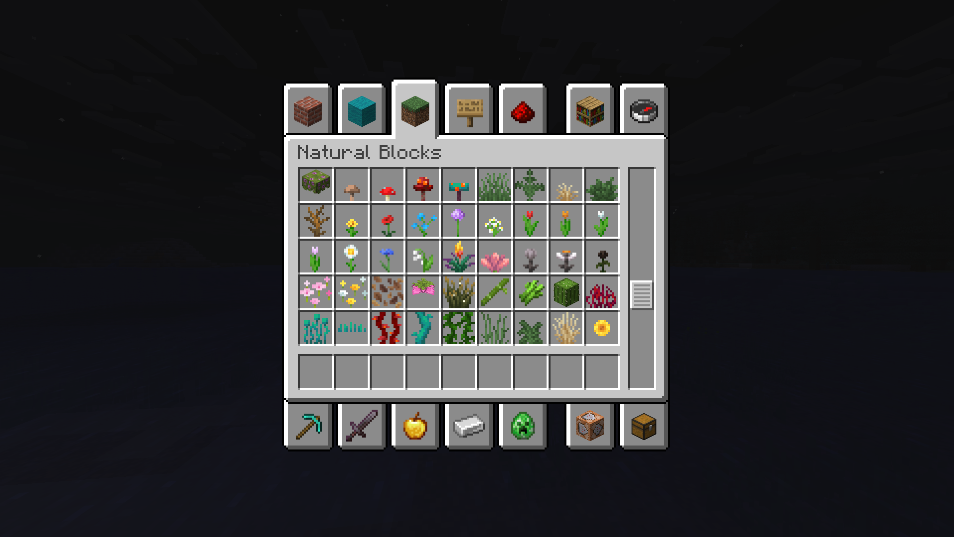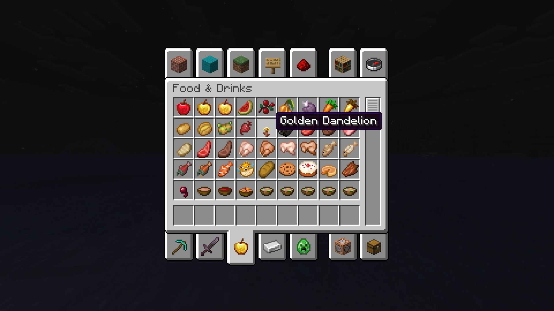 The golden dandelion item is not present in the Natural Blocks tab in the Creative inventory despite the fact that it is flower and all other flower items are there. The item is present in the Foods & Drinks creative tab, even though it is not edible by players. Items that are edible by animals but not by players (like wheat or normal dandelions for example) are not in this tab, so the inclusion of golden dandelions here seems unexpected.