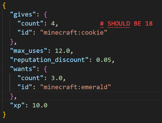 In this version, journeyman farmer only sell 4 cookies for 3 emeralds instead of 18 in original.