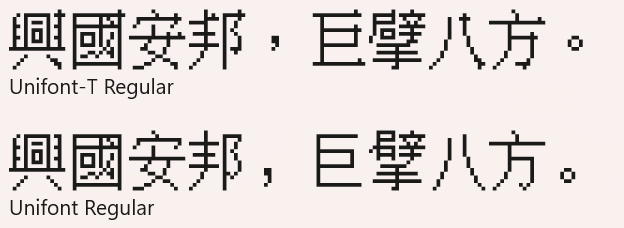 Unifont recently released 17.0.04, which brings a new T-source variant that corresponds to one of the Traditional Chinese (language code being zh-tw in game). By adding this variant to the game, it can help corresponding players with a more familiar kind of glyphs being used in game.