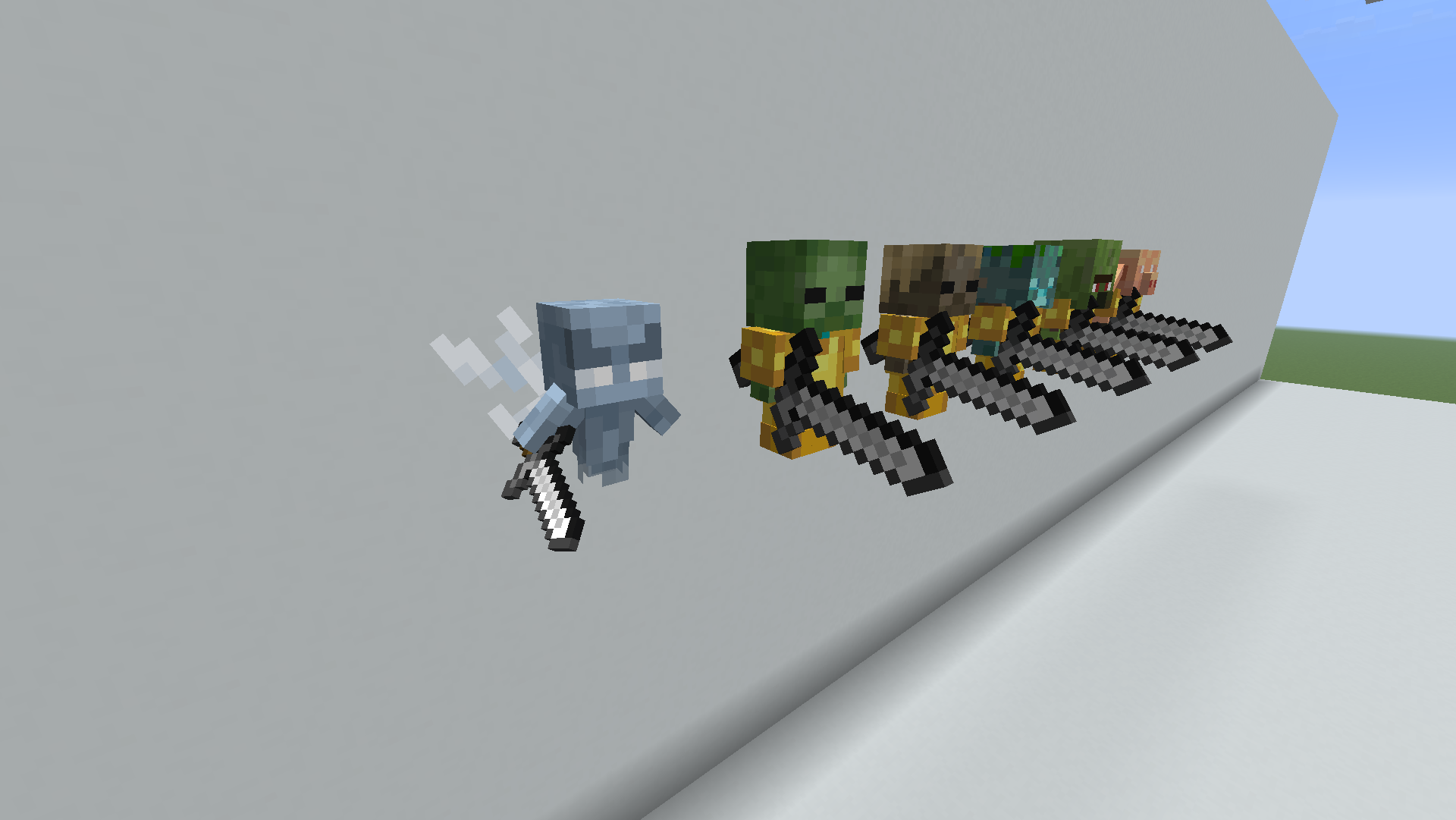 /summon zombie ~1 ~ ~ {IsBaby:1b,NoAI:1b,equipment:{mainhand:{id:"minecraft:iron_sword"},head:{id:"minecraft:iron_helmet"}}}/summon vex ~2 ~ ~ {NoAI:1b,equipment:{mainhand:{id:"minecraft:iron_sword"}}}