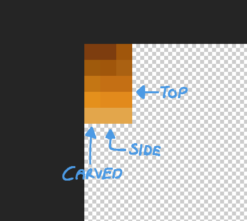 The textures of all the pumpkin faces use 5 shades of orange but the side, top, and carved use different shades of orange instead of the same 5 which makes them slightly off from each other. This is a very nit picky error so i understand if its denied. I Included a color map of all the oranges and labeled them.