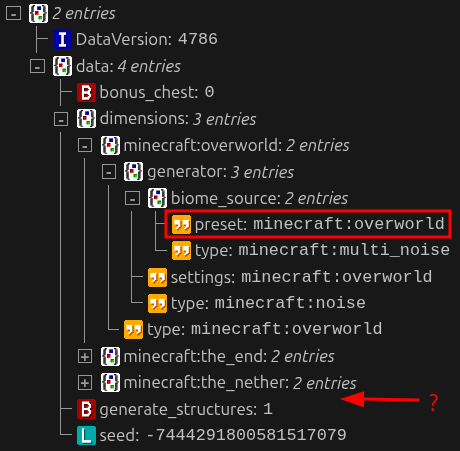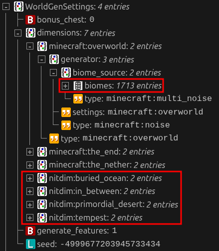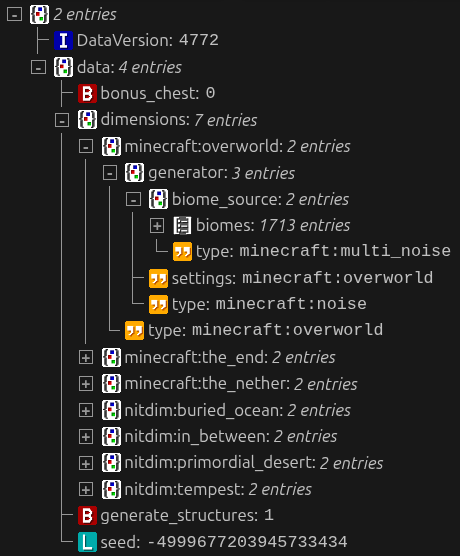 In 26.1, this is no longer the case - see Image 2 to view what world_gen_settings.dat looks like with the exact same datapacks installed. The overworld’s preset is still set and not replaced with Terralith’s biome source; and none of New in Town’s dimensions are registered here either. Both Terralith and New in Town: Dimensions work in game though, so I assume the game reads directly from the datapack instead of copying the data to world_gen_settings.dat.