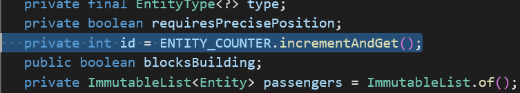 When a loaded or newly spawned entity gets processed, its tracking ID is fetched from an increasing AtomicInteger counter in the line "private int id = ENTITY_COUNTER.incrementAndGet();" within net/Minecraft/world/entity/Entity class