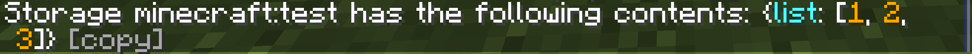 For example, list in storage “minecraft:test“ is {list:[1,2,3]} and you use the command