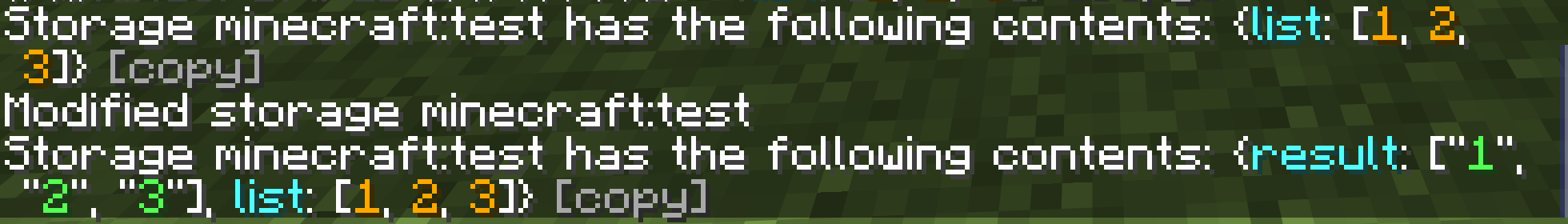 /data modify storage minecraft:test result append string storage minecraft:test list[], you will find that “result“ in storage “minecraft:test“ is like {result:[“1”,”2”,”3”]} instead of {result:”123”}.