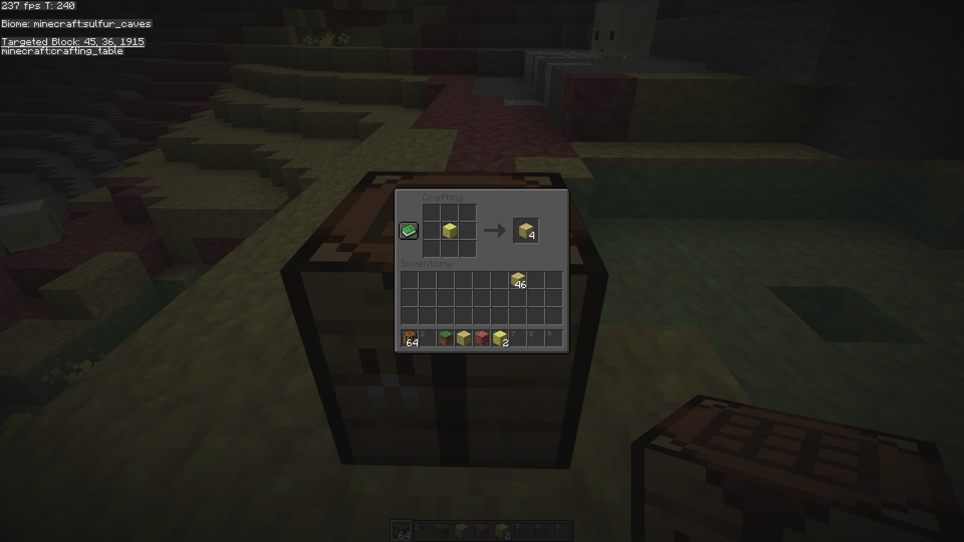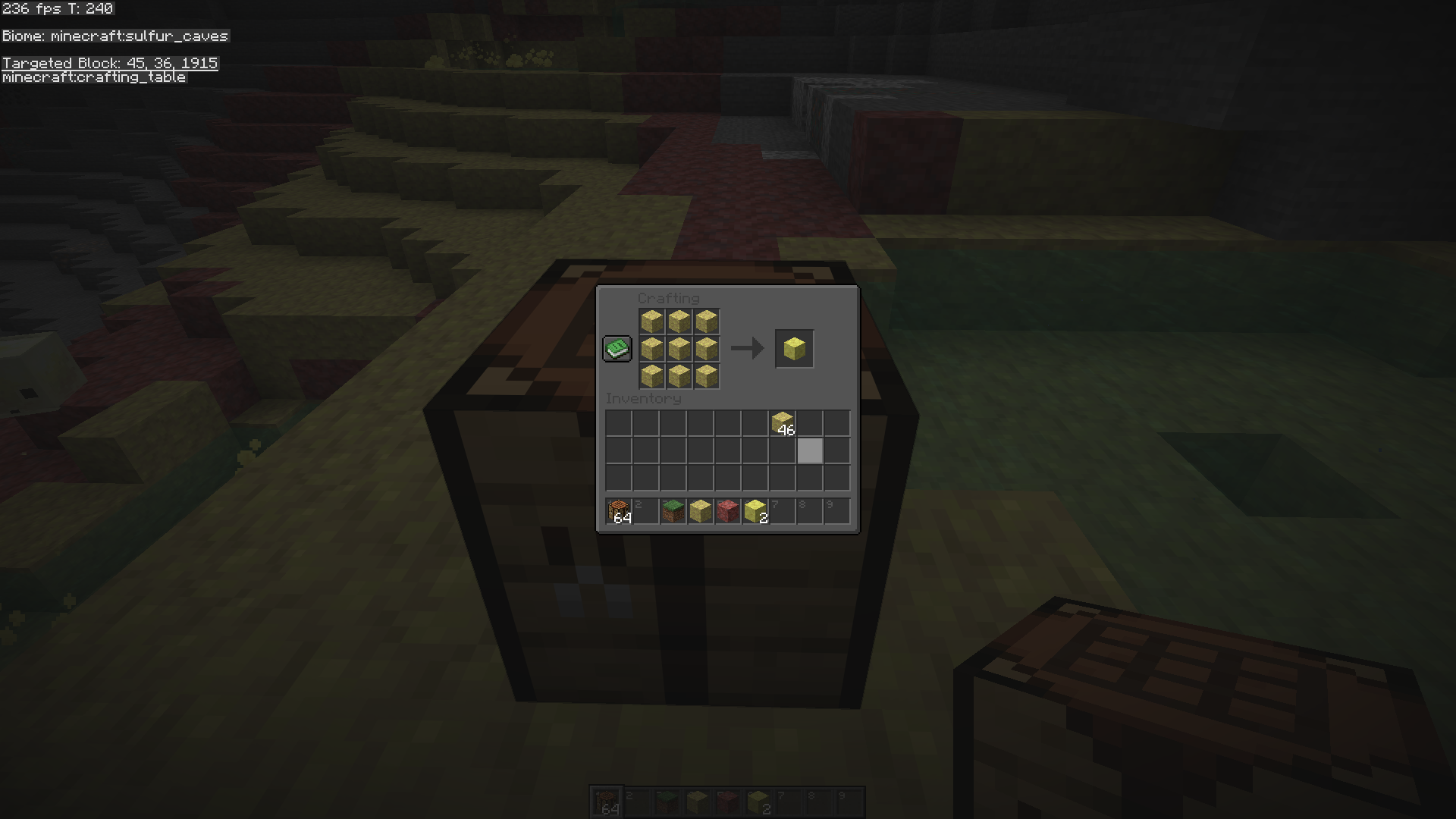 The recipe for crafting sulfur into potent sulfur requires 9 sulfur, however the recipe for crafting potent sulfur back into sulfur gives only 4 sulfur.