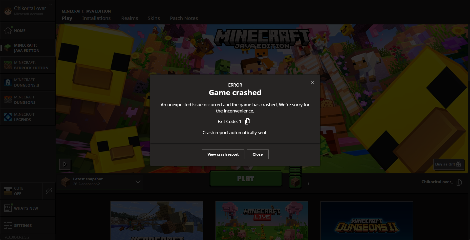 When selecting to play 26.2 Snapshot 2 from the Minecraft Launcher, the game prepares to open, hangs for several seconds, and displays an error screen (see attached screenshot). No game window for Minecraft is opened at any point. This seems to be an issue with running the game with Vulkan.