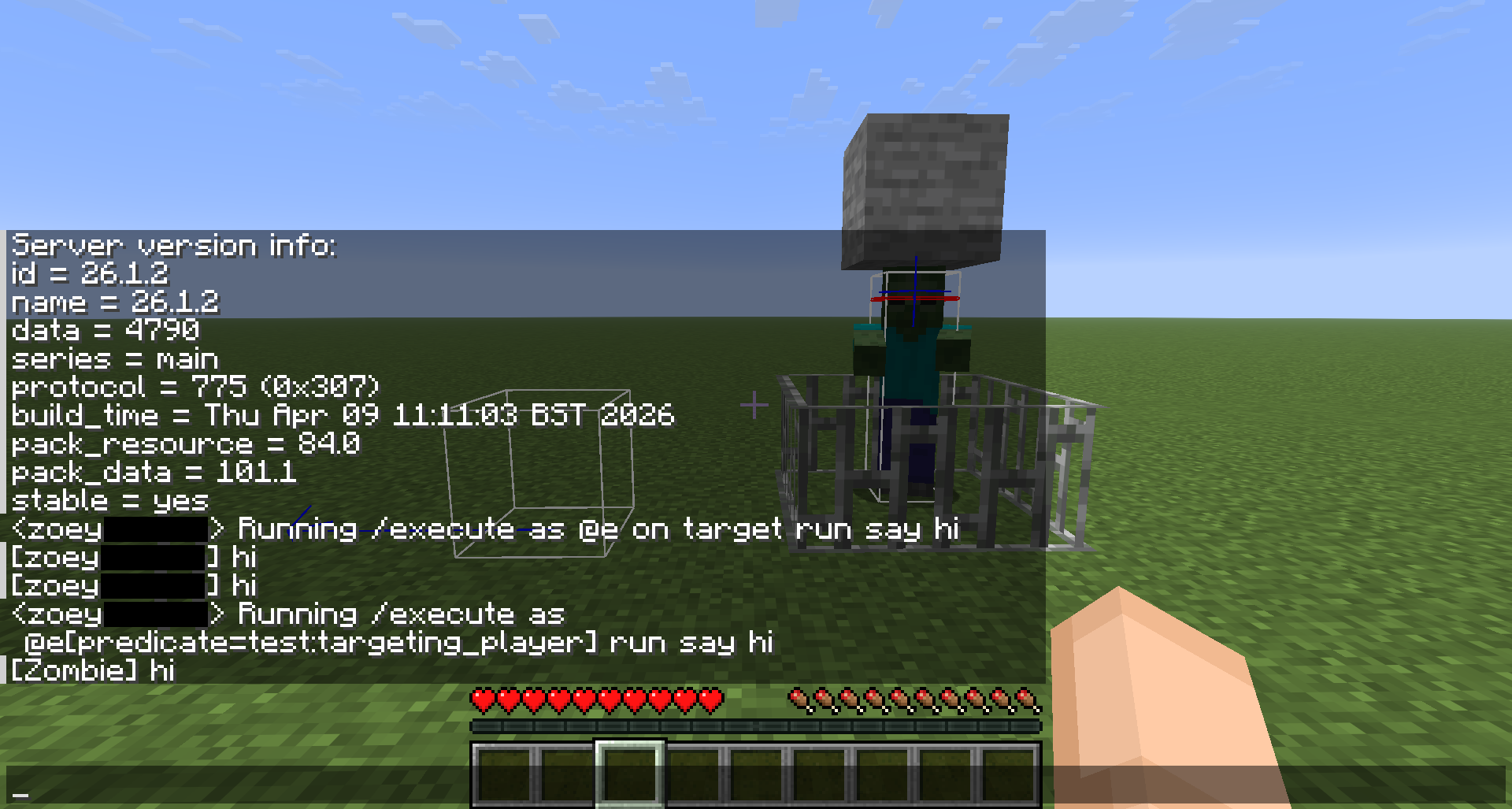 Spawn a zombie, either through /summon or with a spawn egg, to use as a control for the test. (Block it in so it can’t hurt the player, burn to death, or wander off while testing)