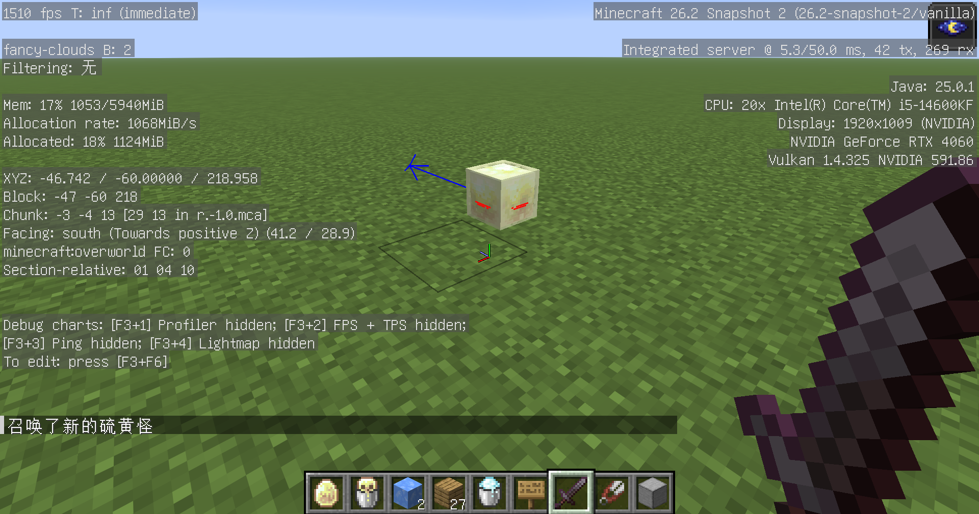 0 0:/summon minecraft:sulfur_cube ~ ~ ~ {NoAI:1, Rotation:[0f,0f]}Press