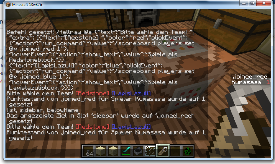 /scoreboard objectives add joined_red dummy1.) I made a CommandBlock which outputs a /tellraw Command where you can click on 2 `Buttons`, called Redstone and LapisLazuli.