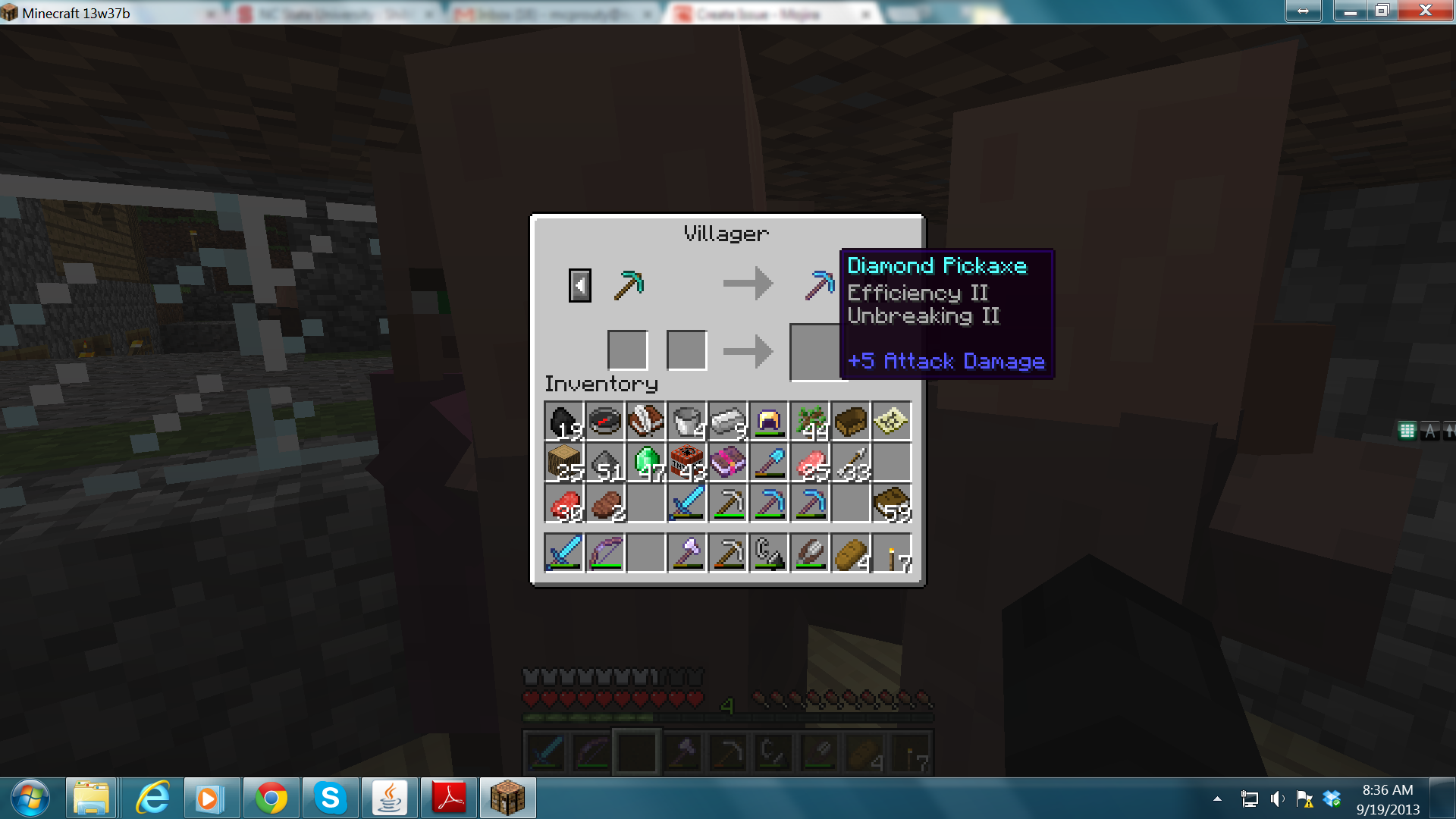 Villager trading involving two object inputs, one of them being emeralds, now require only the non emerald input. For Example, a village previously accepting a book and 48 emeralds, and returning sharpness IV, now accepts just a book and returns an enchanted book. This is the case for enchanted tools (pick axe, sword), as well as for trades of gravel and emeralds for flint.