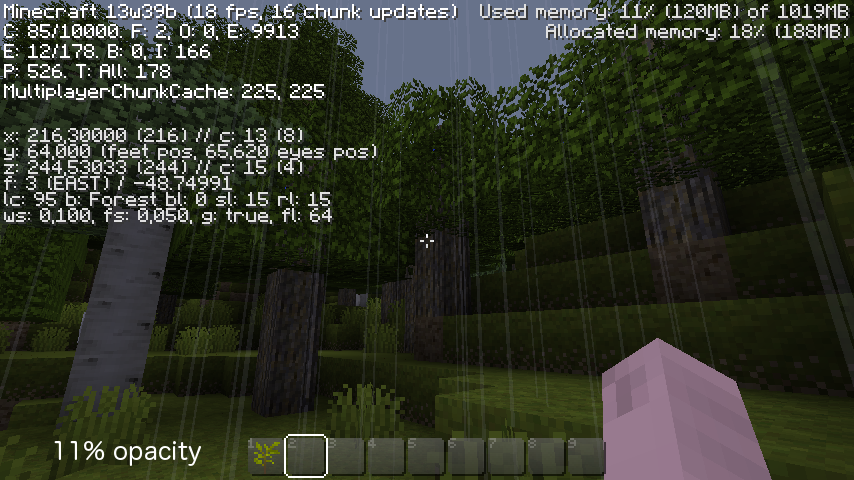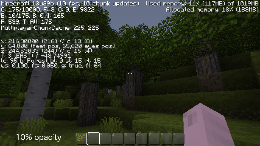 The following pictures were taken with a test texture (2 vertical white lines at fixed opacity): the first one in 1.6.4 at 10% opacity displays correctly; the second one in 13w39b disappears; the third one has 11% opacity and shows up again.
