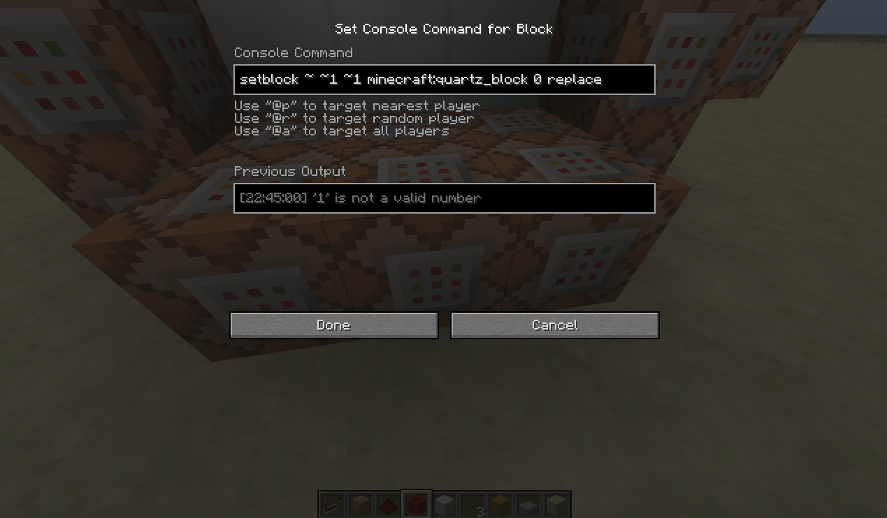 I was in the process of making a command block to run a /setblock command using relative coordinates, when I copied some code from a different command block. I then pasted said command into a different command block. I expected the blocks to get placed where I had specified in the command, however, the blocks were not placed, and the output (within the command block GUI) said that my number was not valid.