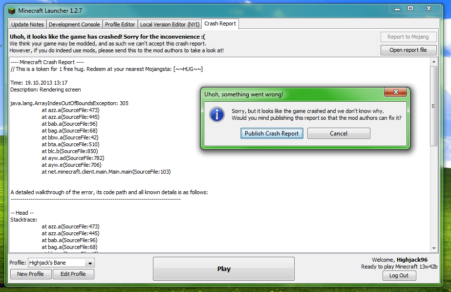 When i launch the with selecting 13w42b on my profile it crashes and turn back to launcher with crash reporter opened