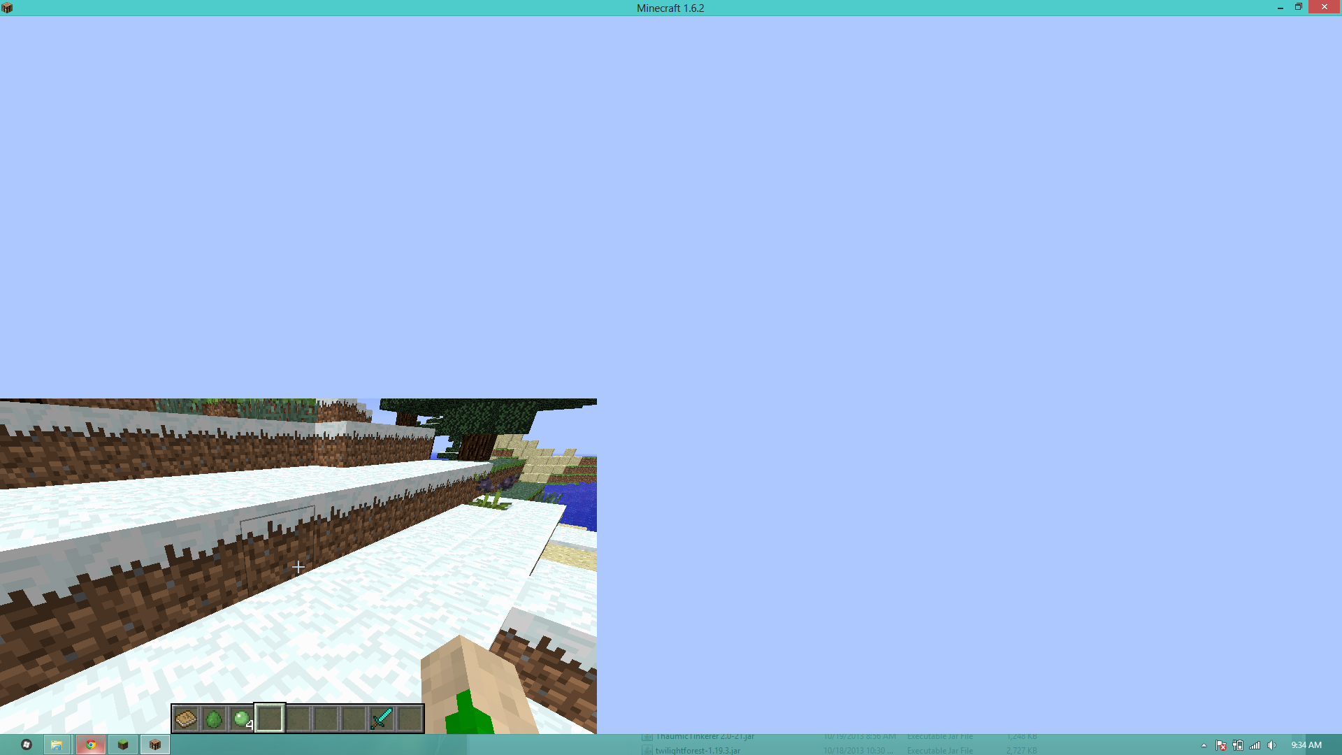 I maximized the game window right when minecraft was switching between the "building world" screen and the actual world, and this happened. (images below). Returning to the main menu does not fix it. I didn't try resizing the window, but quitting and restarting works. Also, everything else works fine, it just seems to be a rendering issue. No crash log, because no crash.