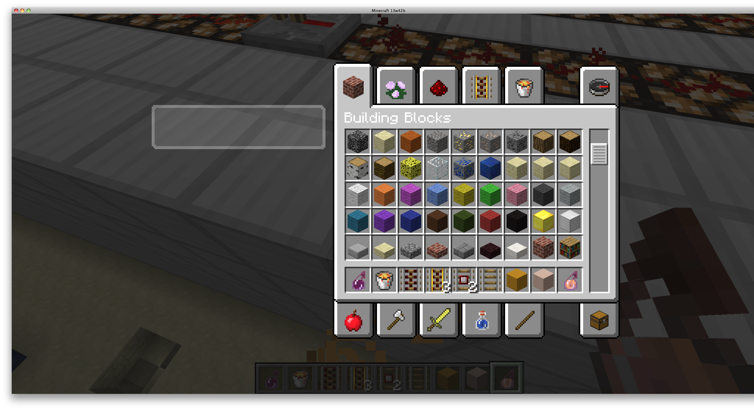 When I opened my world in 13w42b, I hit my invetory button and then there was a white blob right next to my creative menu. Before i was playing this world in 13w41b and I had a status affect on me then when I opened it in 13w42b the status effect was still there, but instead of saying Fire Resistance 00:00, it was just a white blob.