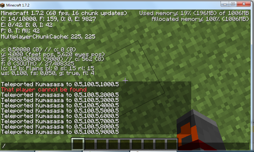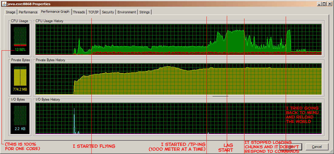 After about 2 minutes of flying (or about 6 times /tp), video starts lagging. When continuing to explore, the lag becomes as severe as hanging ~15 seconds, and will cause an OutOfMemory exception, a died thread (the Server thread). and weird behavior