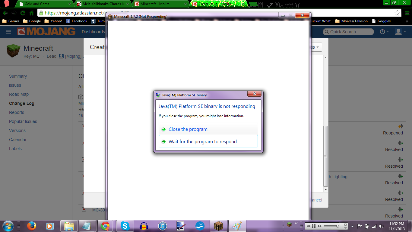 When playing in fullscreen mode, either by toggling the option in the menu or pressing F11, and attempting to minimize the game or allow it to run in the background by pressing the start button, Alt-Tab, or when another program pops-up in the foreground, the game will always minimize to whatever your default window size is and any in-game display will be solid white, and clicking anywhere within the box or trying to minimize or close the window with end with a message that "Java(TM) Platform SE binary is not responding." Waiting will not eventually allow Java to recover and with closing you may occasionally lose a minute or two of progress. This error does not occur when exiting fullscreen by toggling the option or pressing F11.