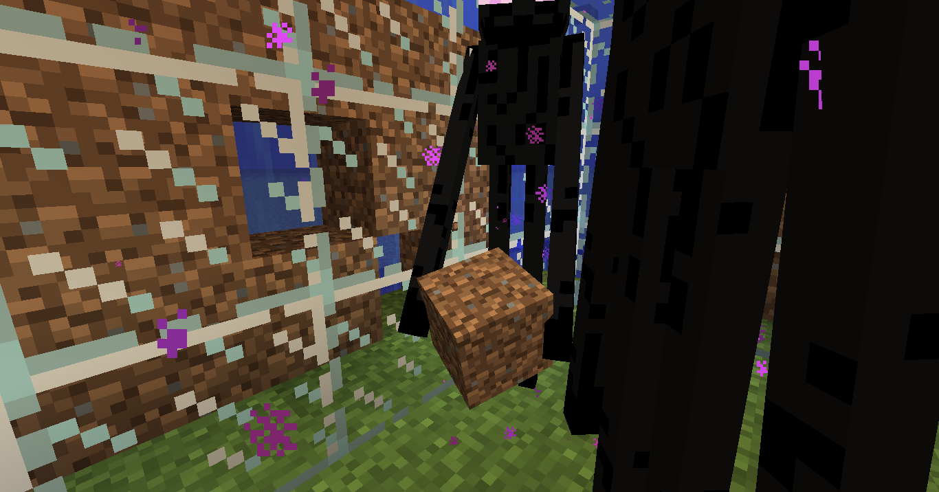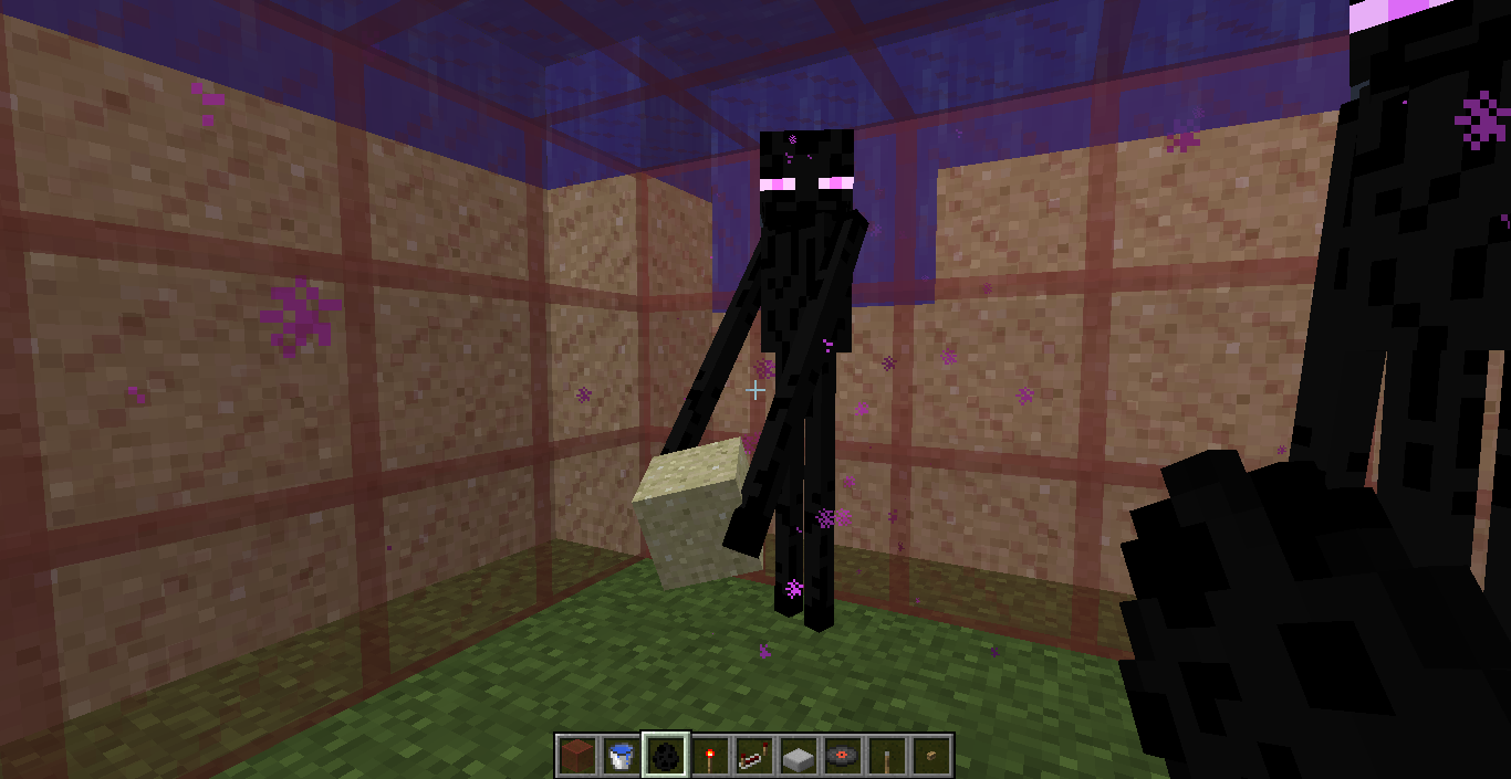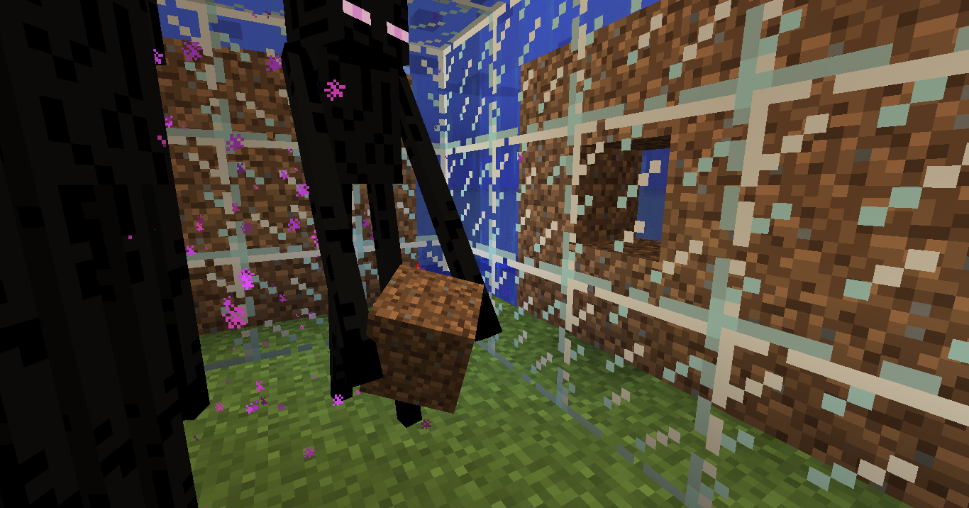 I was building a glass mural with patterns of dirt and sand behind it. I had a few Endermen teleport into the room with me, and noticed that they were removing the sand and dirt blocks behind the layer of glass. At first I thought this was a result of using transparent blocks, but further testing shows that Endermen can pick up blocks behind any layer of material. I understand that Endermen have a reach similar to that of the player, but I do not know if this is intended. After all, the player cannot mine blocks they cannot see.