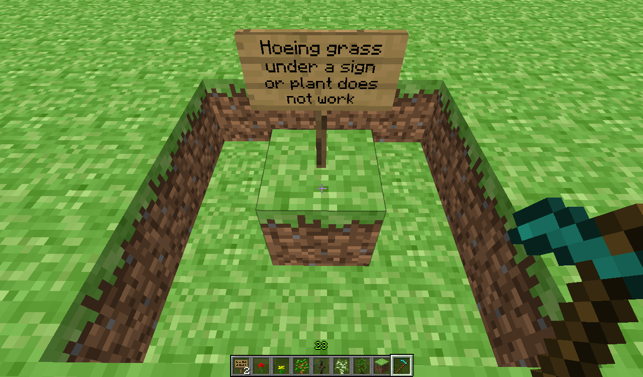 When Tall grass/fern/saplings/sign is placed on dirt the dirt can be hoed and turned into farmland, but grass can't be tilled under them.