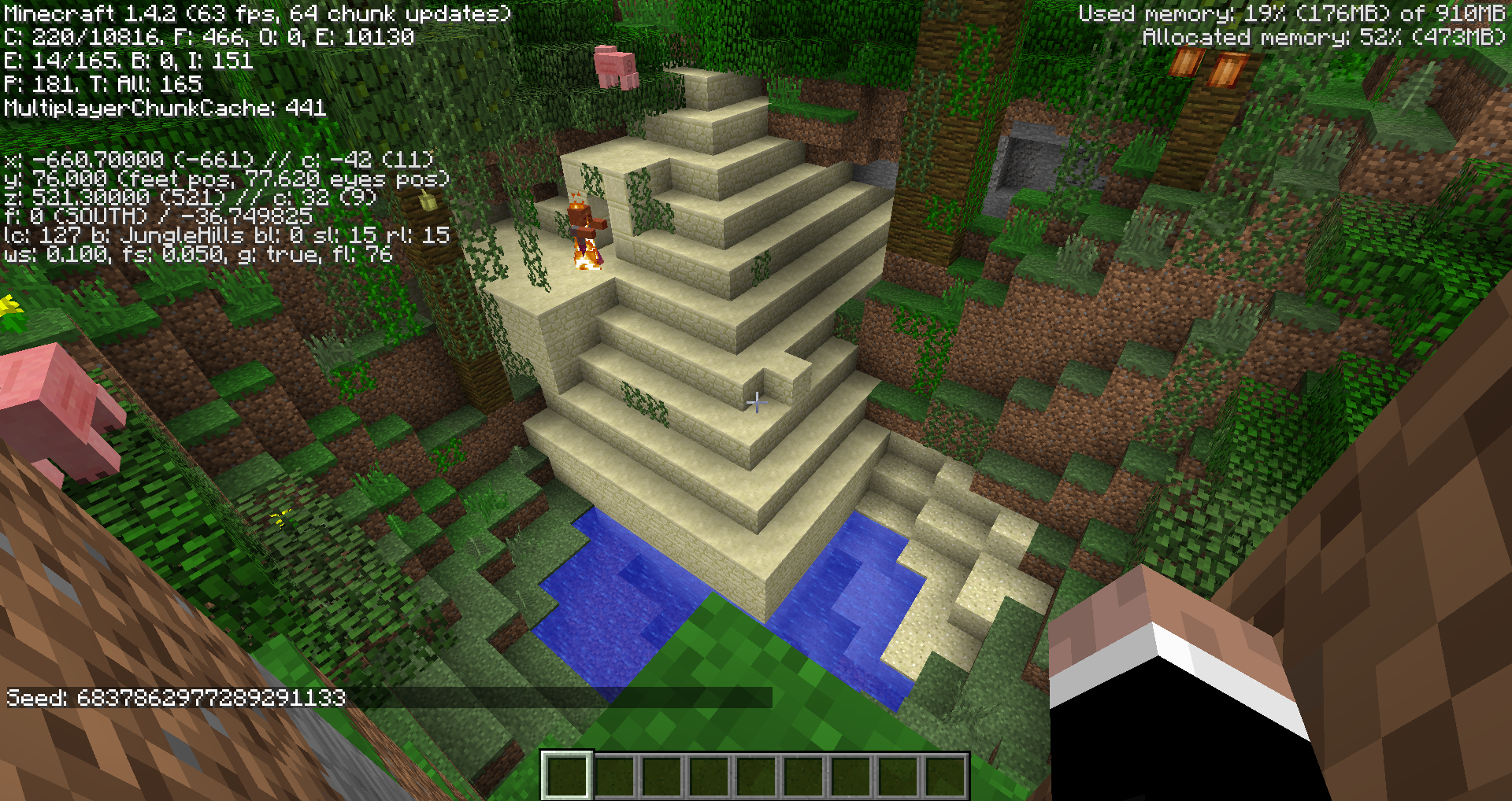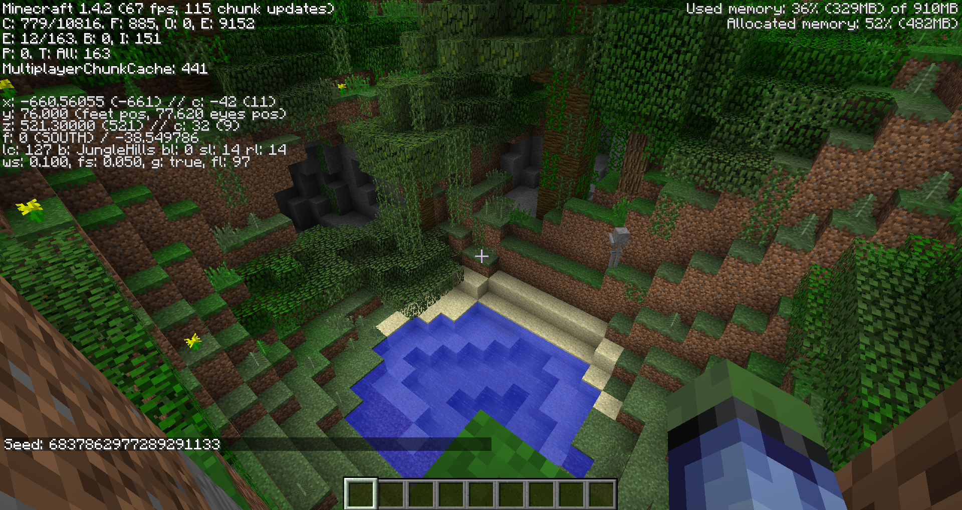 Fresh world created in 1.4.2, seed and coordinates shown.