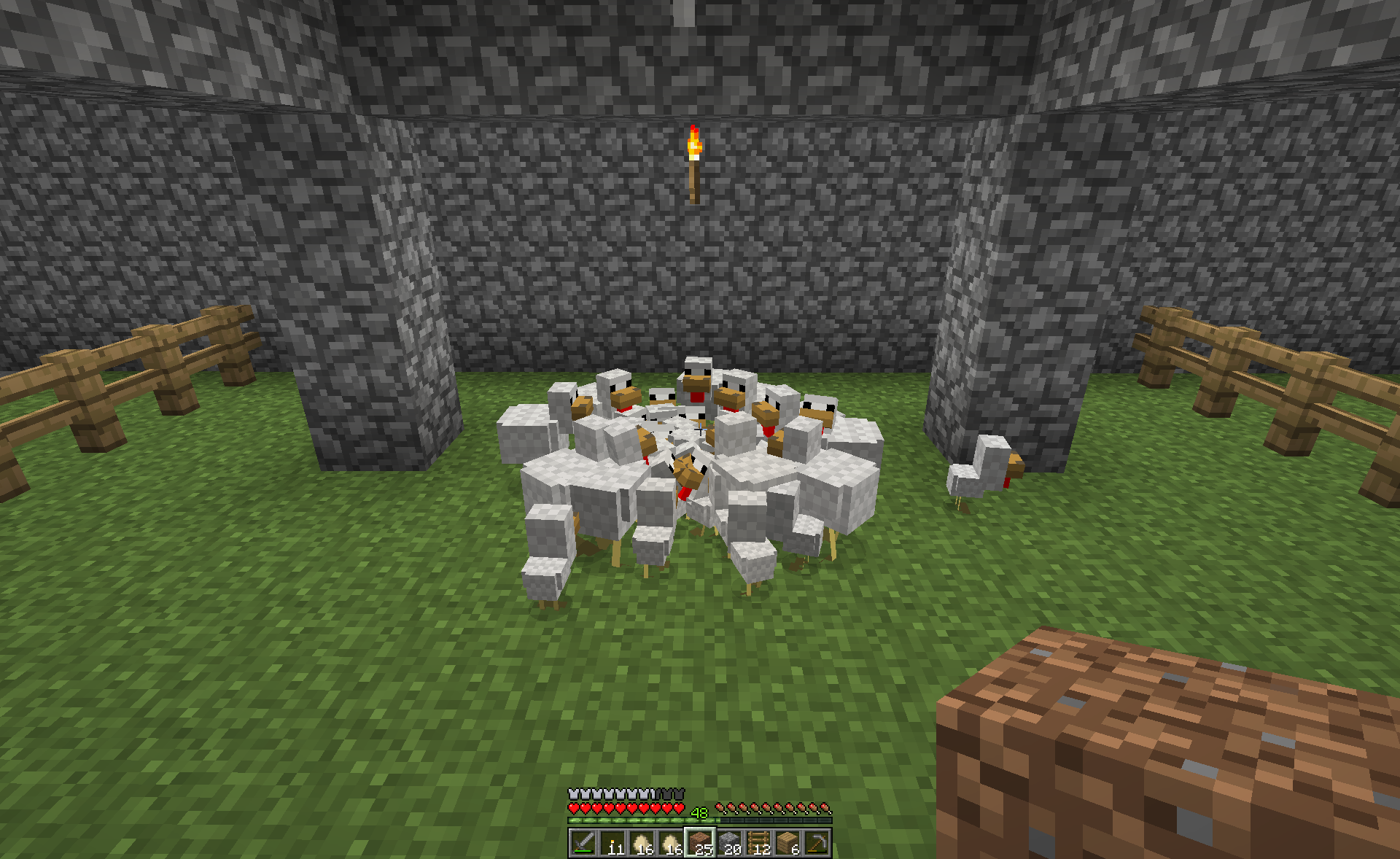 Placing a block near the vortex of death causes the chickens to begin a mad game of "king of the hill". What's interesting is while the king of the hill game is on, chicks dropping from the dispenser do not join them, they behave normally. If it's Y coordinate related, the ground is 7 blocks below the egg producing chickens, the "hill" is 6 and offset by about four blocks. Removing the block resumes the swirling vortex of death mode.