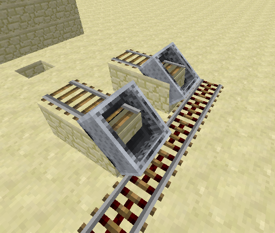 The minecart is about to snap on the lower rails but is breaked by the unpowerd upper accelerator rail.