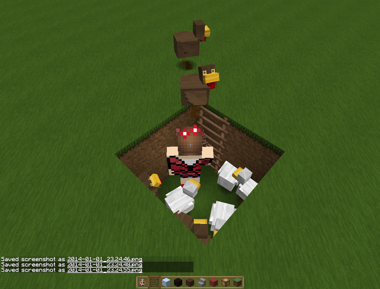 Chickens were put in a 2x2x2 hole in the ground with a ladder in the corner going up. When the player character is positioned on the block with the ladder the chicken will get lifted/jump up on the player and then to the surface.