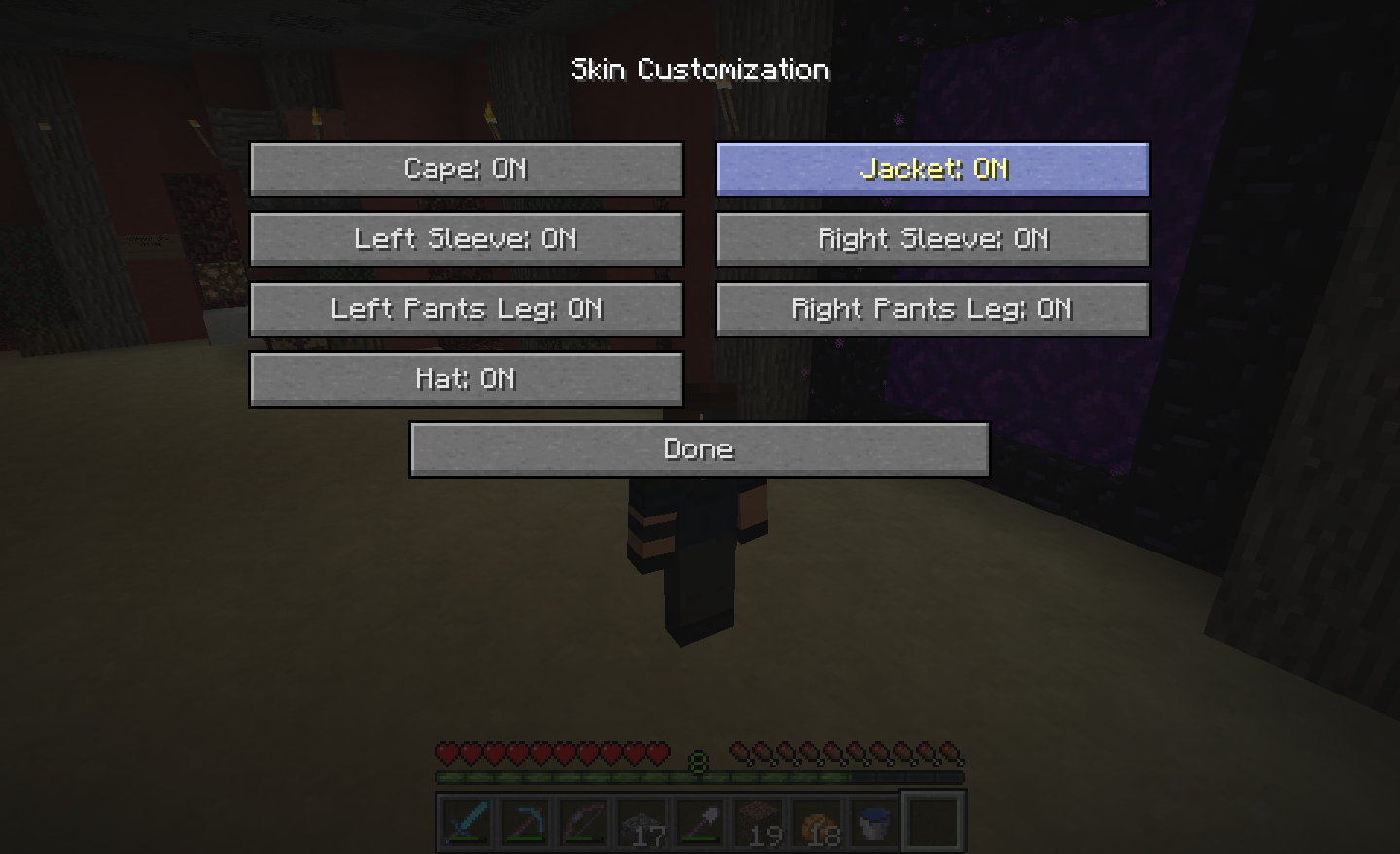The Jacket layer (and probably the other layers, I haven't checked yet) vanishes upon going through a Nether portal and does not seem to re-appear until cycling the "Jacket" option in Skin Customization.