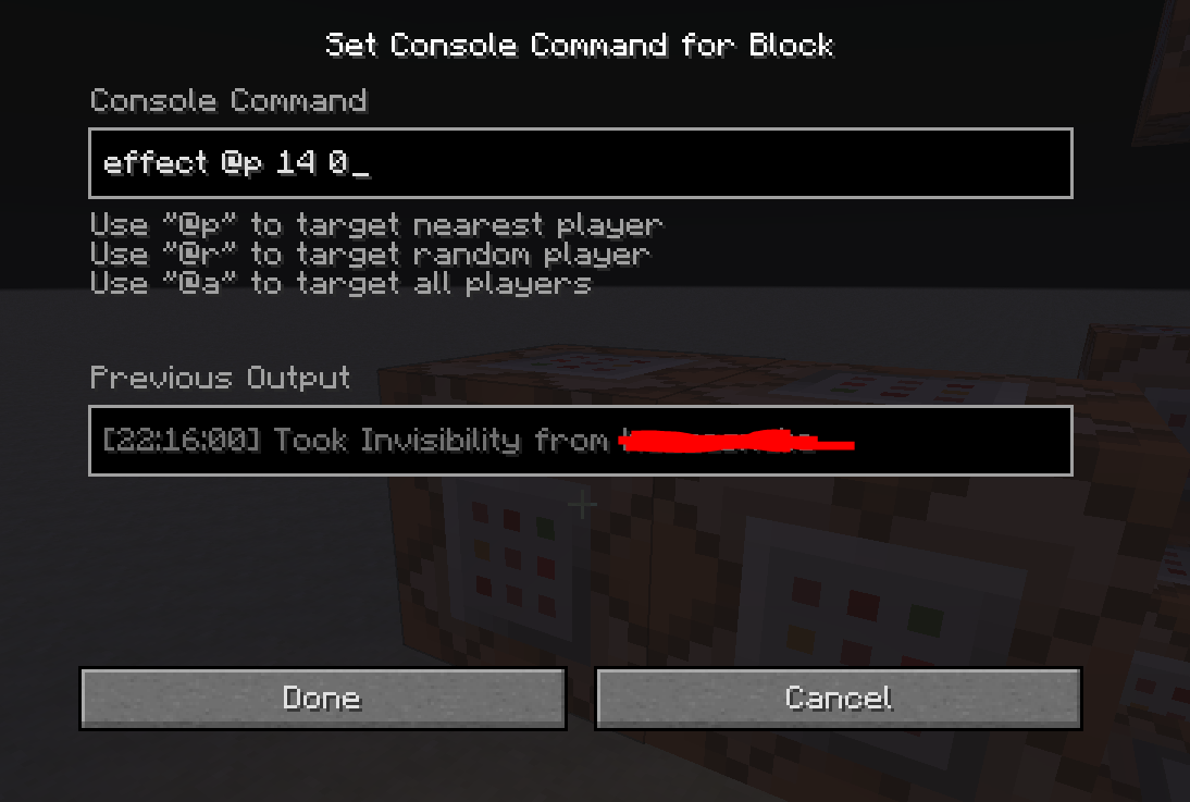 I wanted to run a clock that would give myself a potion effect for 1 seconds "/effect @p 14 1 0", it worked however when the clock stopped and the potion effect ran out; in the inventory it displayed 0:00 but did not disappear. I then tried removing it with "/effect @p 14 0" and it stayed despite the command block displaying "Took Invisibility from [Player Name]"