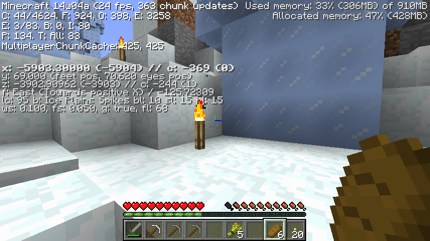 My computer works really well with minecraft. At 8 chunks I can get reach 200 fps. After updating to 14w04a, I logged into my friends multiplayer server (same issue in SP) and was struck by the amount of lag i would get. I would drop deep into the 20 fps range. When standing still I found my computer going up in fps. It seems to occur when more chunks get loaded. The chunk updates are usually around 300-400 when moving. Sometimes I can hit 1000