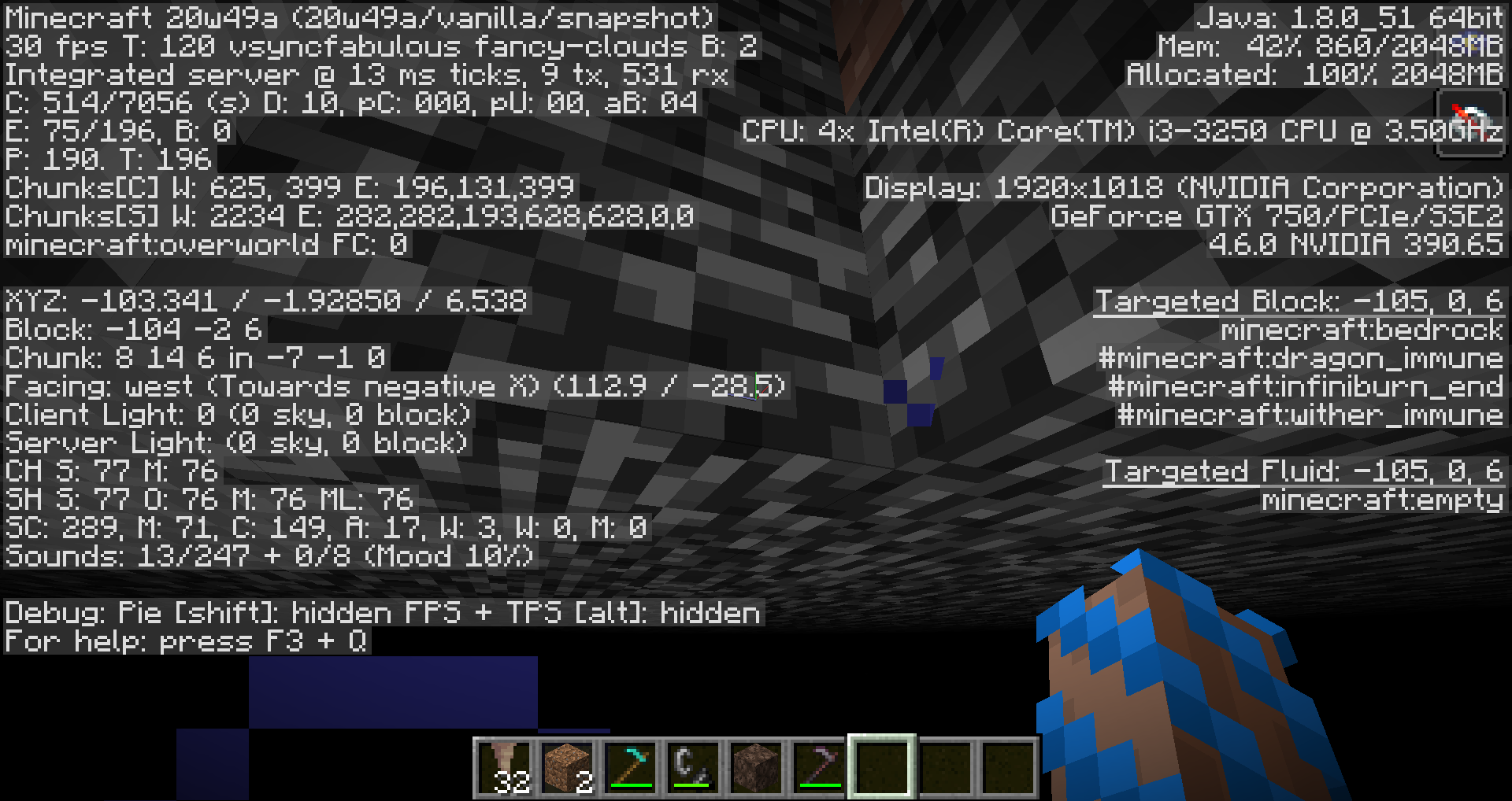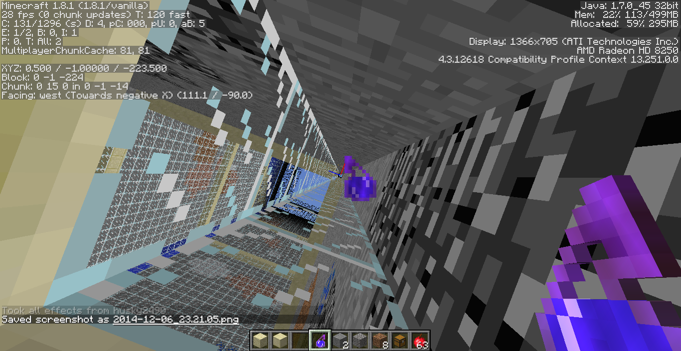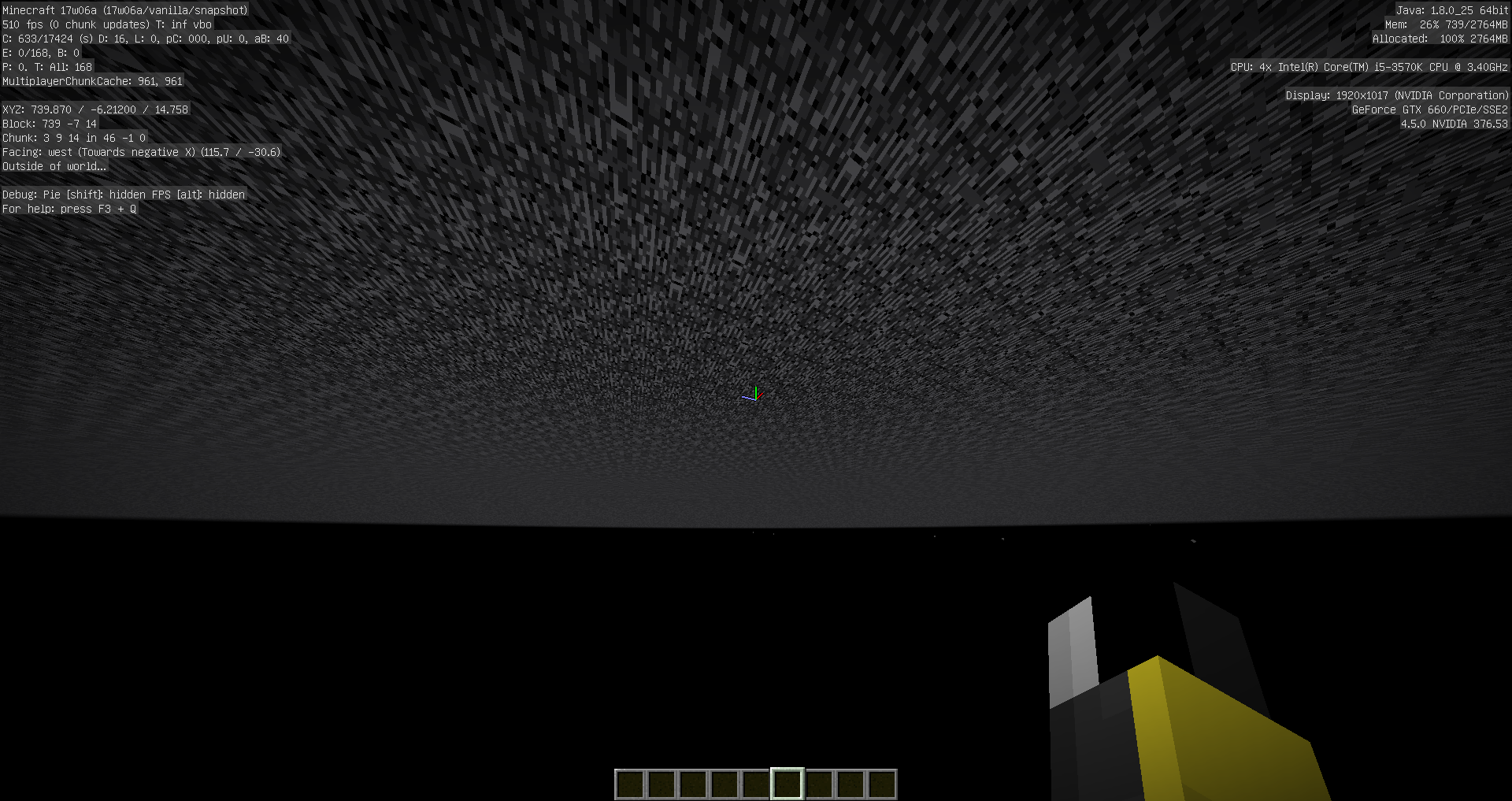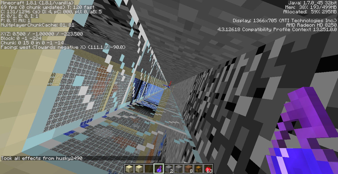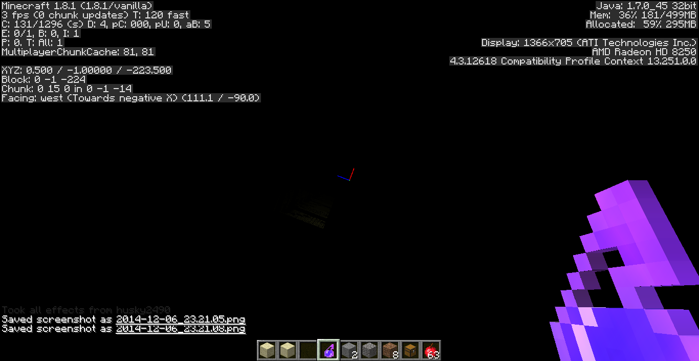 If the player is under the effects of both Blindness and Night Vision at the same time, the world becomes completely black. HUD things like hand, debug info and inventory, as well as the sky, are still visible. This also occurs if you have Blindness while underwater, or Night Vision while at a negative Y level.