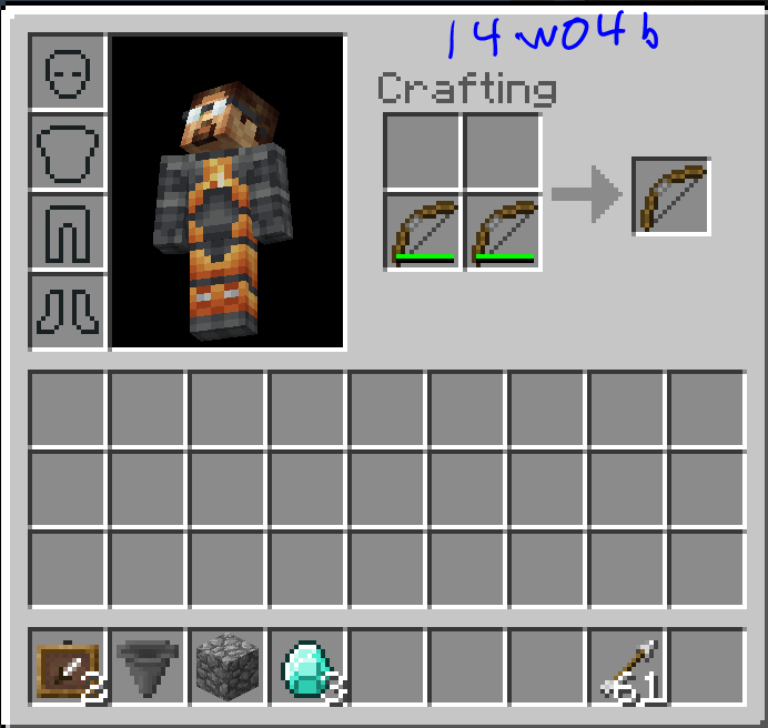 There seems to be a new bug with the crafting repair in 14w05b. The bows can now repair but the 3rd bow is now duplicating. When I put 2 broken bows in my 2x2 crafting grid the product square showed a repaired bow. I took that bow, got a bow to put in my inventory and the 2 original broken bows were still in my 2x2 grid, and the product bow was still in the product box. I was able to take the repaired bow as many times as I wanted. Definite item duplication bug